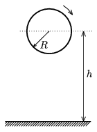 P. 3736. Vízszintes felület felett h=0,95 m magasságban lévő R=0,2 m sugarú abroncsot \(\displaystyle \omega\)0=5 s-1 szögsebességgel megforgatunk, és kezdősebesség nélkül elengedünk. Az abroncs a vízszintes felülettel való ütközés után a felületet v=2 m/s sebességgel hagyja el, és \(\displaystyle \omega\)1=3 s-1 szögsebességgel forog.