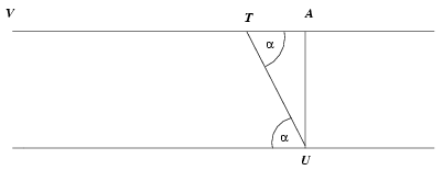 Megoldás. Jelölje a vitorlás helyét kezdetben V, az úszó helyét U, a találkozás helyét T. Legyen továbbá AU = 200. Találkozásukig a vitorlás \(\displaystyle VT=VA-TA =2000-200\text{ctg\,}\alpha\), az úszó pedig \(\displaystyle UT= \dfrac{200}{\sin\alpha}\) métert tesz meg. A megtett utak aránya sebességük arányával egyenlő, ezért