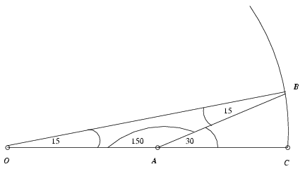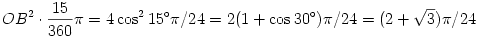 Megoldás. Az OAB szög 150o-os, mivel a 30o-os BAC kiegészítő szöge. Az egyenlőszárú OAB háromszög másik két szöge ezért 15o. Ebből OC = OB = 2cos 15o, így a BOC körcikk területe