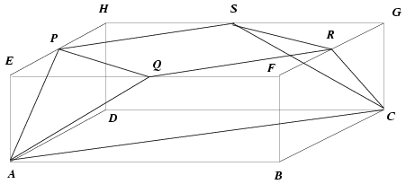 A kapott test a téglatestből úgy kapható, hogy abból kivágjuk az ABCQFR és a vele egybevágó ACDPSH csonkagúlát valamint az EAQP és a vele egybevágó GSRC tetraédert. Előbbiek térfogata