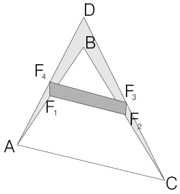 Látható, hogy \(\displaystyle t_{F_1F_2F_3F_4}=t_{ACD}-\left(t_{DF_4F_3}+t_{AF_1F_4}+t_{F_3F_2C}+t_{ACF_2F_1}\right)\). Legyen \(\displaystyle t_{F_1F_2F_3F_4}=t\), tABD=t1, tDBC=t2 és tACB=t3. Fejezzük ki a bevezetett ismeretlenek segítségével a kérdéses területet. Tudjuk, hogy tACD=t1+t2+t3. Az F3F4 az ACD háromszögben középvonal, így a DF3F4 és az ACD háromszögek hasonlóak, a hasonlóság aránya 1:2, emiatt \(\displaystyle t_{DF_4F_3}={t_1+t_2+t_3\over4}\). Az F1F2 az ABC háromszög középvonala, a hasonlóság miatt itt \(\displaystyle t_{ACF_2F_1}={3t_3\over4}\). Az ABD háromszögben F1F4, továbbá a BCD háromszögben F2F3 szintén középvonalak, ebből adódóan \(\displaystyle t_{AF_1F_4}={t_1\over4}\) és \(\displaystyle t_{CF_3F_2}={t_2\over4}\). Ekkor a keresett terület: \(\displaystyle t=t_1+t_2+t_3-\left({t_1+t_2+t_3\over4}+{t_1\over4}+{t_2\over4}+{3t_3\over4}\right)={t_1+t_2\over2}.\) Mivel t1+t2=tABCD, ezért \(\displaystyle t={t_{ABCD}\over2}\).