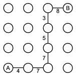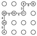 Megoldás: A leggyorsabb utat a legegyszerűbben úgy kaphatjuk meg, ha B-ből visszafelé indulva minden körbe beírjuk, hogy onnan legkevesebb mennyi idő alatt lehet megközelíteni B-t. Így sorban haladva, és mindig felhasználva a korábban egy adott kereszteződésre megállapított minimális értéket, az alábbi ábrát kapjuk: