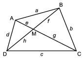 Jelöljük az átlók metszéspontjától a csúcsokig húzott szakaszok hosszát az ábrának megfelelően e, f, g, h-val. Írjuk fel a háromszög-egyenlőtlenséget az ábrán látható négy kis háromszögben: a < e + f, b < f + g, c < g + h, d < h + e. A kapott egyenlőtlenségeket összeadva a + b + c + d < 2(e + f + g + h). A bal oldalon a kerület, a jobb oldalon az átlók összhosszának kétszerese látható, melyből 2-vel való osztás után kapjuk az első bizonyítandó állítást. A második állítás bizonyításához írjuk fel a háromszög-egyenlőtlenséget az ABD, ABC, BCD, CDA háromszögekben: a + d > h + f, a + b > e + g, b + c > h + f, c + d > e + g. Az egyenlőtlenségeket összeadva, és a kapott egyenlőtlenség mindkét oldalát 2-vel osztva az a + b + c + d > e + f + g + h egyenlőtlenséget kapjuk, ami éppen a második bizonyítandó állítás.