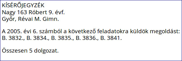 A postán beküldött megoldásokhoz kísérőjegyzéket kérünk a minta szerint, a borítékban egy külön papíron felsorolva az összes beküldött dolgozat jelét és számát. A név, osztály és iskola feltétlenül szerepeljen a kísérőjegyzéken!