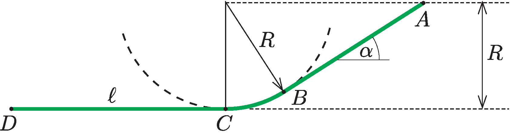 P. 5537. Egy kalandparkban az erre vállalkozók egy \(\displaystyle R\!=\!20~\text{m}\) magas, \(\displaystyle {\alpha\!=\!30^{\circ}}\)-os hajlásszögű lejtő tetejéről (\(\displaystyle A\)), kezdősebesség nélkül, szabadon (fékezésmentesen) gurulhatnak lefelé egy kicsiny kocsiban. A lejtő törésmentesen csatlakozik egy \(\displaystyle R\) sugarú, körív alakú pályaszakaszhoz (\(\displaystyle B\)), majd a pálya a legmélyebb pontjától (\(\displaystyle C\)) vízszintesen folytatódik tovább. A vízszintes szakaszon a megfelelő módon fékezett kocsi időben egyenletesen lassul, és \(\displaystyle \ell=2R\) út megtétele után a \(\displaystyle D\) pontnál megáll.