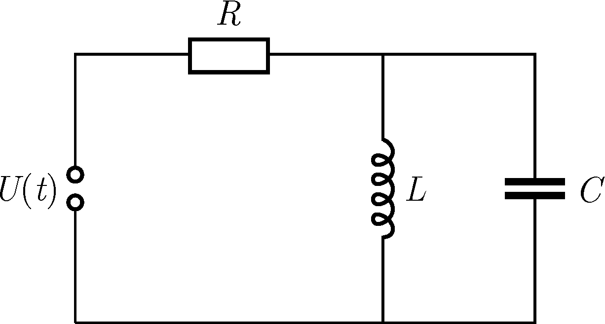 P. 5542. Egy \(\displaystyle R\) ellenállásból, egy \(\displaystyle L\) induktivitású tekercsből, egy \(\displaystyle C\) kapacitású kondenzátorból és egy \(\displaystyle U(t)=U_0\sin(\omega t)\) feszültségű generátorból az ábrán látható egyszerű áramkört hozzuk létre.